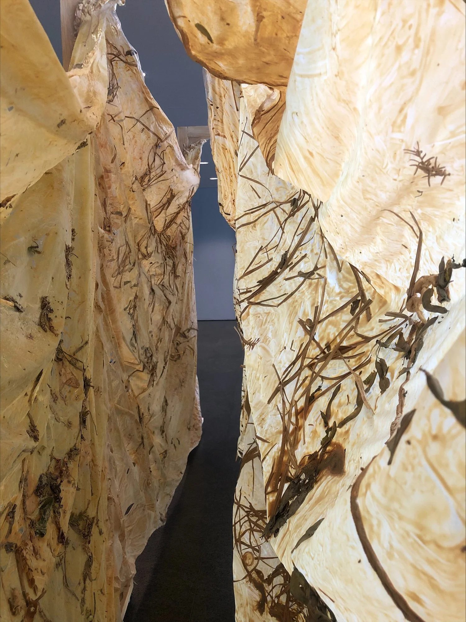 gulch swallows the viewer in a tactile experience of plant matter and detritus suspended in the mucosa of latex. The emergent space, radically foregrounding interiority, questions the unconscious tension between our bodies and constructed space. Inspired by the contemporary queer minimalism of Eva Hesse and Bruce Nauman, the Logan Center Co-Creation Grant allowed for material and conceptual exploration into public installation, resulting in an interactive experience for the wider community.